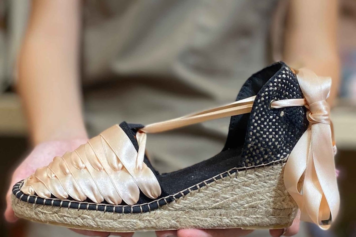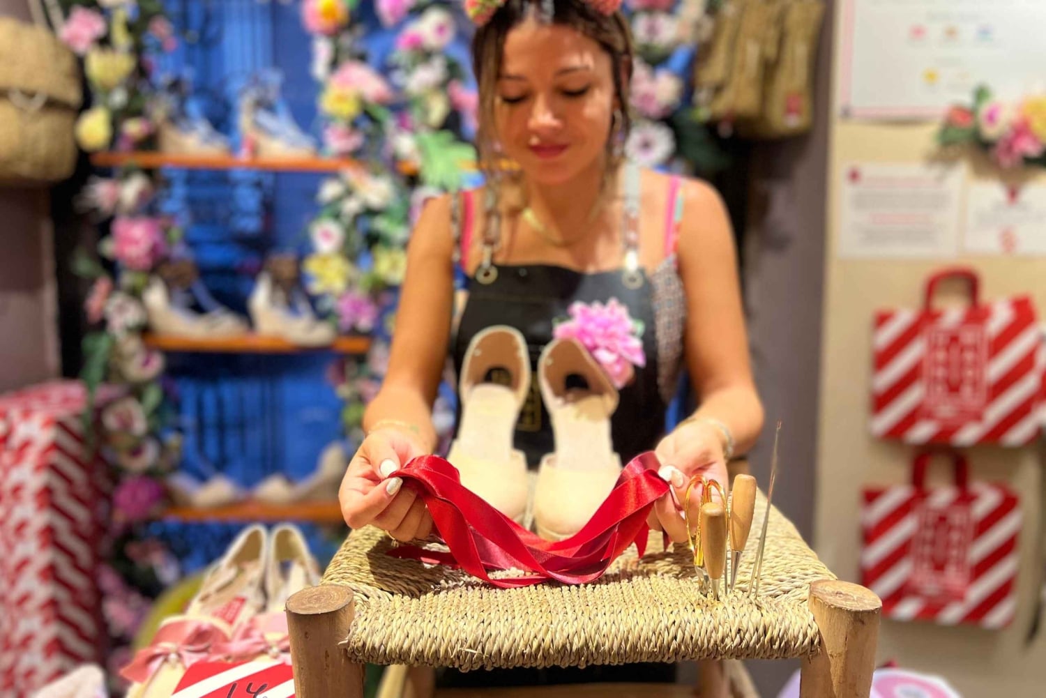 Descubrirás los secretos más profundos de esta maravillosa tradición. Junto con maestros artesanos, fabricarás tu propio par de alpargatas. Escogiendo a mano entre más de 100.000 combinaciones diferentes, elegirás el tamaño de la base, el estilo de cosido y el color y tipo de los cordones. Una vez hechas, ¡aprenderás las diferentes formas de atártelas!