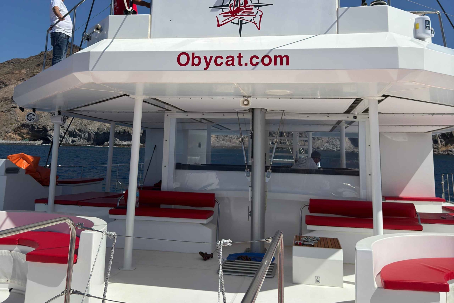 ✨ Sail with Obycat and enjoy an unforgettable experience ✨ Embark on a modern and comfortable catamaran to discover the crystal-clear waters of the Atlantic. We will set sail from Puerto Rico to the idyllic unspoilt beaches of Veneguera or Tiritaña, an oasis of tranquillity and natural beauty. Explore and enjoy Swim, snorkel, or simply relax on deck. Enjoy the sun on our floating solarium while you let yourself be carried away by the sea breeze. ️ All-inclusive Savor a delicious meal and refreshing drinks without worrying about a thing. Our crew will be at your disposal so that all you have to think about is enjoying yourself. A magical day in Gran Canaria Let yourself be seduced by the beauty of the ocean and the freedom of sailing. Book now and make your day an unforgettable adventure! Food, drinks, and activities. All-inclusive. Drinks are included throughout the trip. Beer, cava, soft drinks, and water. Lunch includes paella, salad, papas arrugadas con mojo, and seasonal fruit. Activities: Floating solarium and snorkeling (goggles and snorkels available) Recommendations: Swimwear, towel, something warm, hat, and sunscreen.Includes