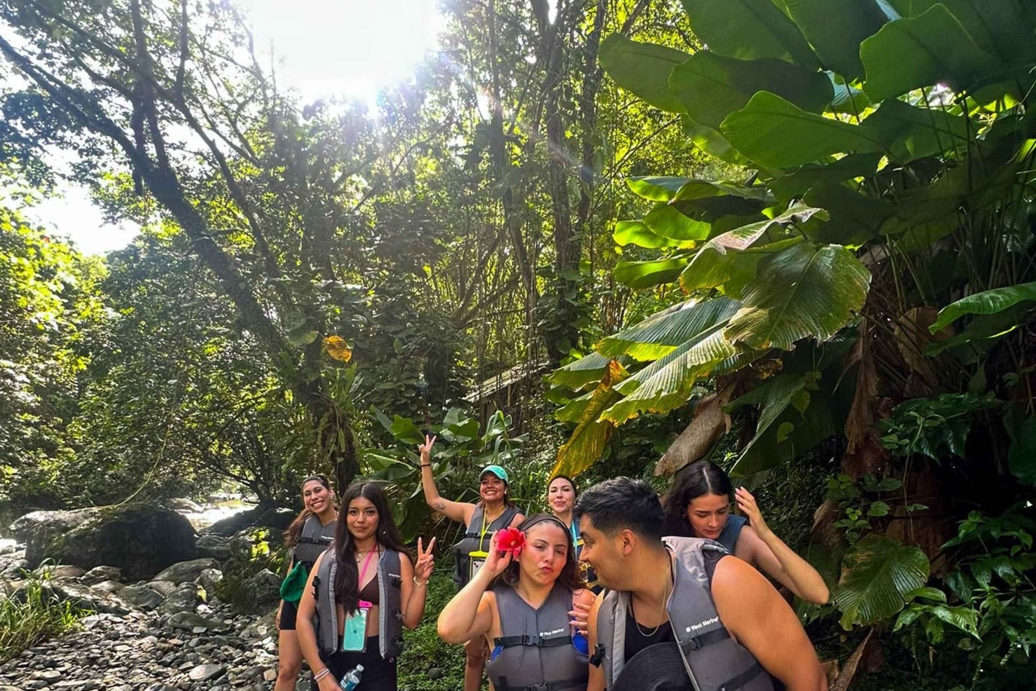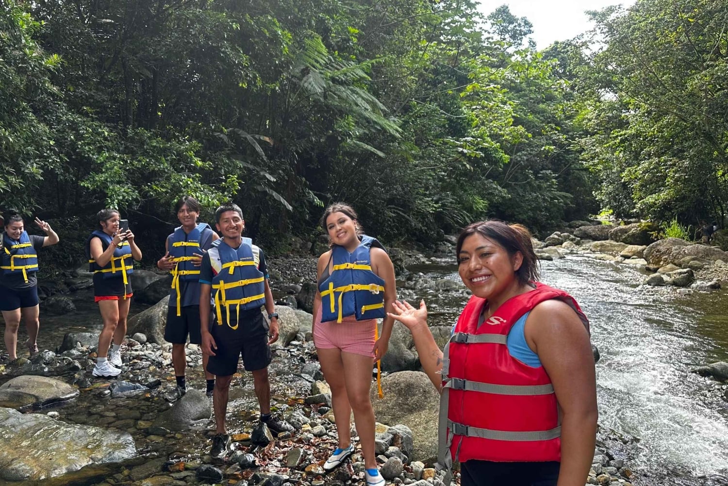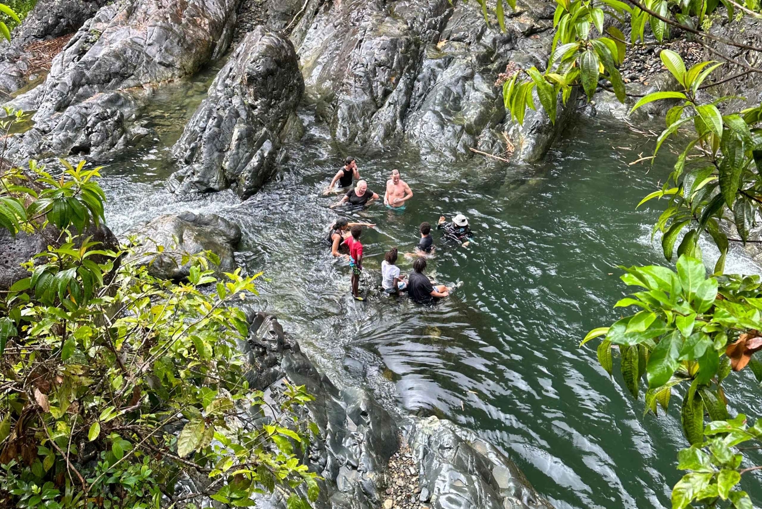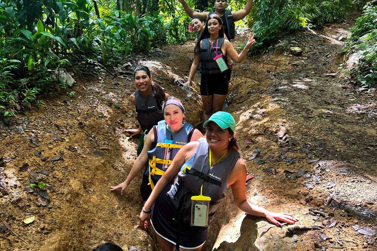Caminha por trilhos panorâmicos na selva, rodeado por plantas tropicais exuberantes e vida selvagem. Refresca-te com um mergulho refrescante sob cascatas deslumbrantes e experimenta a emoção de deslizar por escorregas de água naturais. Sentes-te ousado? Experimenta um salto de penhasco opcional ou um baloiço de corda sobre o rio (se o tempo permitir).